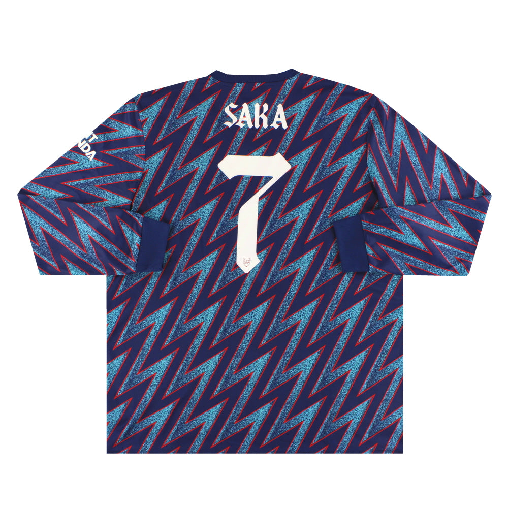 Condition Details – Pristine colour, very smooth material, badges and sponsor are excellent Features – Saka #7 to reverse in official plastic printThird shirt inspired by the iconic ‘Blue Lightning’ kits produced by Nike in the 1990s . Worn when Arsenal finished 5th in the Premier League, narrowly missing out on Champions League football after finishing 2 points 4th place following 2 defeats in their final 3 games of the season against Tottenham and Newcastle.